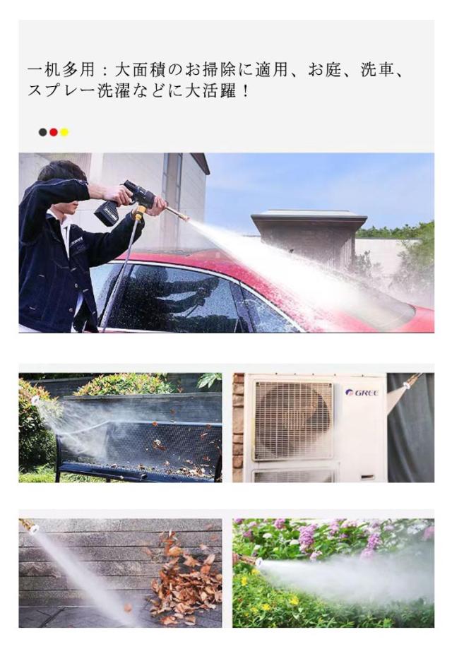 | サイズについての説明 | セット内容物:本体*1、バッテリー*1、充電器+給水ホース5m*1、収納ケース*1、クイックコネクタ*1、ノズル*2、フィルタ*1、ボトルコネクタ*1、ステンレス鋼延長ロッド*1、バケツ*1 最大給水口温度:65℃ 最大出力:10A 最大電圧:21V 吐出圧力:3.5MPa 最大の圧力:22bar 電流:120AN 電源:充電式リチウムバッテリー 噴射距離:約10m |