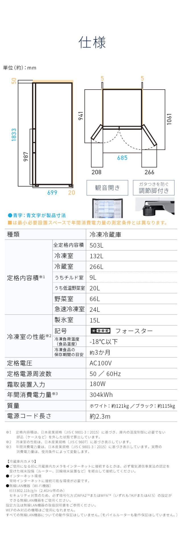 ※1:定格内容積は、日本工業規格(JIS C9801-3:2015)に基づき、庫内の温度制御に必要でない部分(ケースなど)を外した状態で算出しています。