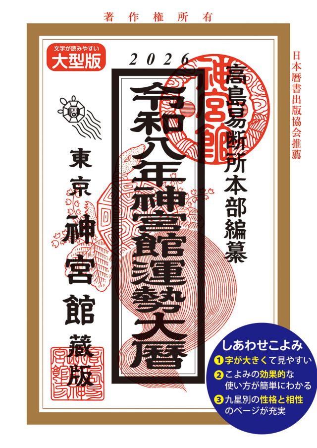 【関連商品キーワード】運勢大暦 B5大判 令和8年 2026年 神宮館 暦 こよみ 大判 開運 縁起物 運気UP ゲン担ぎ 厄除け 厄払い 初詣 新年 お正月 大晦日 年末 九星気学 運勢 年運 月運 日運 占い 相性 六輝 大安 仏滅 赤口 先勝 先負 友引 中段 二十八宿 選日 大安 一粒万倍日 天赦 年中行事 冠婚葬祭 日取り 吉方位