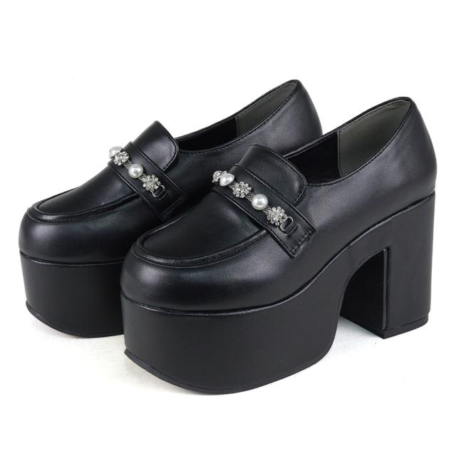 パールとビジューで華やかに仕上げた、10?pヒールの厚底ローファーパンプス。