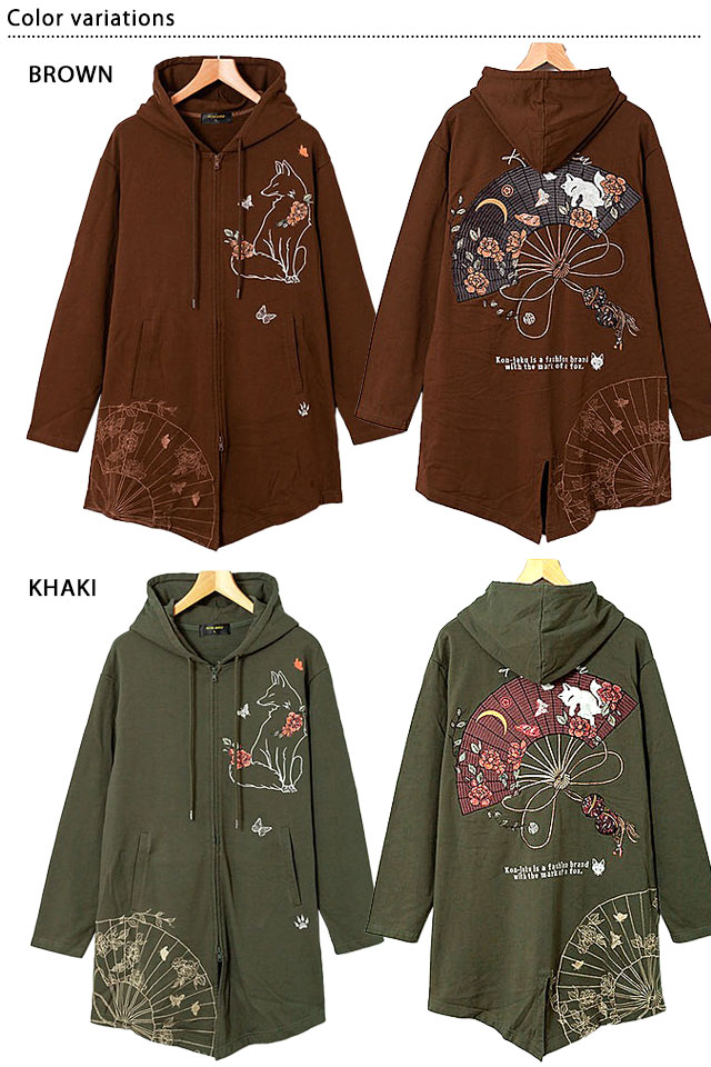 愛らしい狐のキャラクターが主役の【今昔】から「牡丹柄の扇子」総刺繍ロングパーカー(KJ-29146)」のご紹介です。