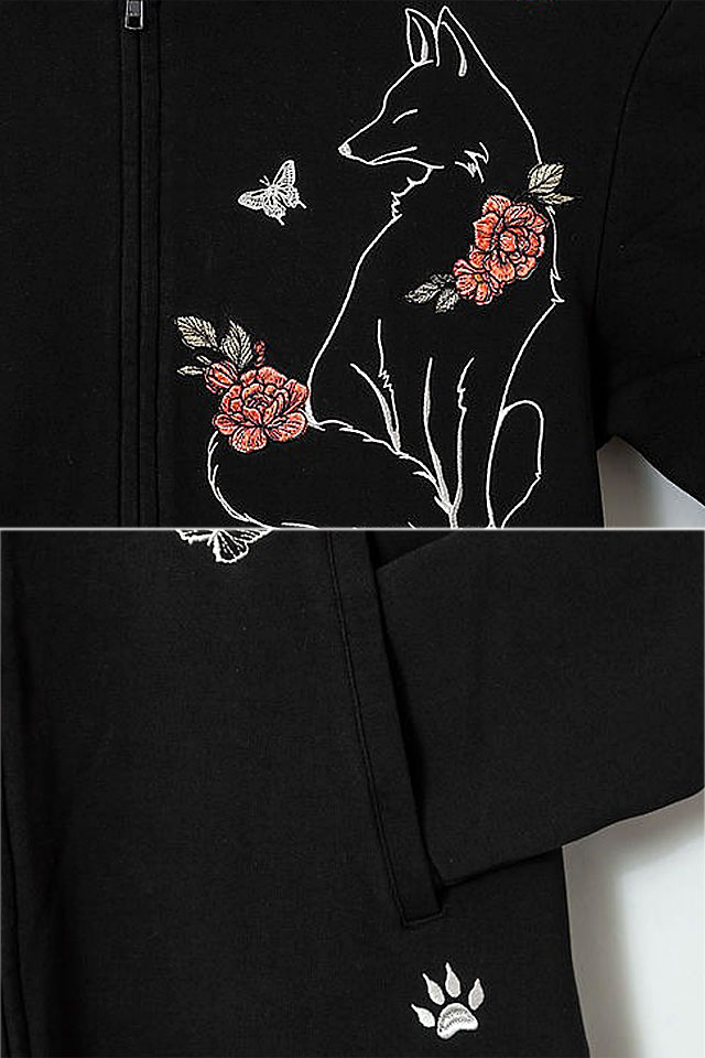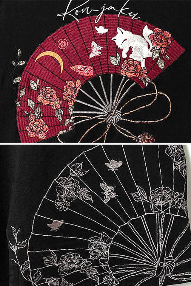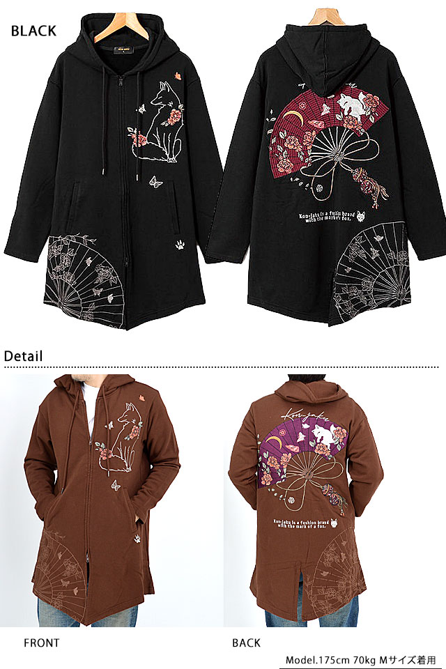 「牡丹柄の扇子」総刺繍ロングパーカー 今昔 KJ-29146 和柄 和風 狐 きつね キツネ ユニセックス