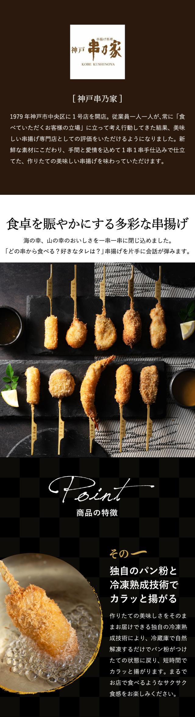 素材の持ち味を生かした、サクッと軽やかな食べ心地。神戸の串揚げ専門店〈串乃家〉の味をご家庭でお楽しみいただけます。選び抜かれた海の幸、山の幸を一串一串に封じ込めました。お好みのタレでお召しあがりください。