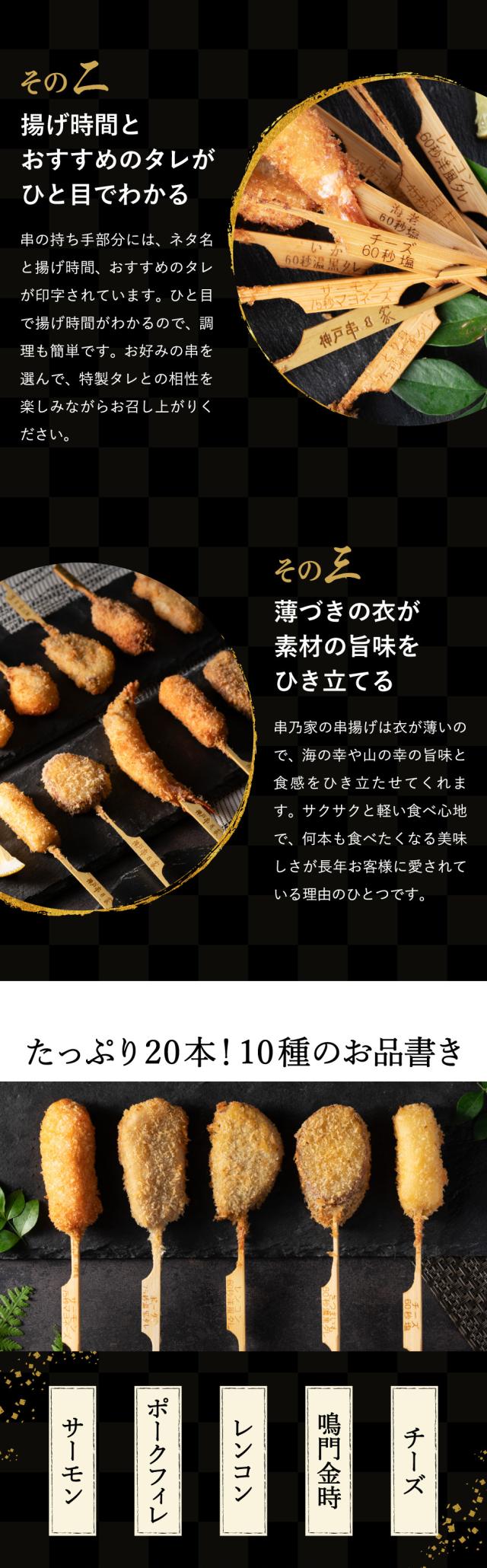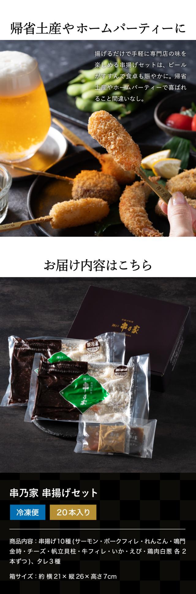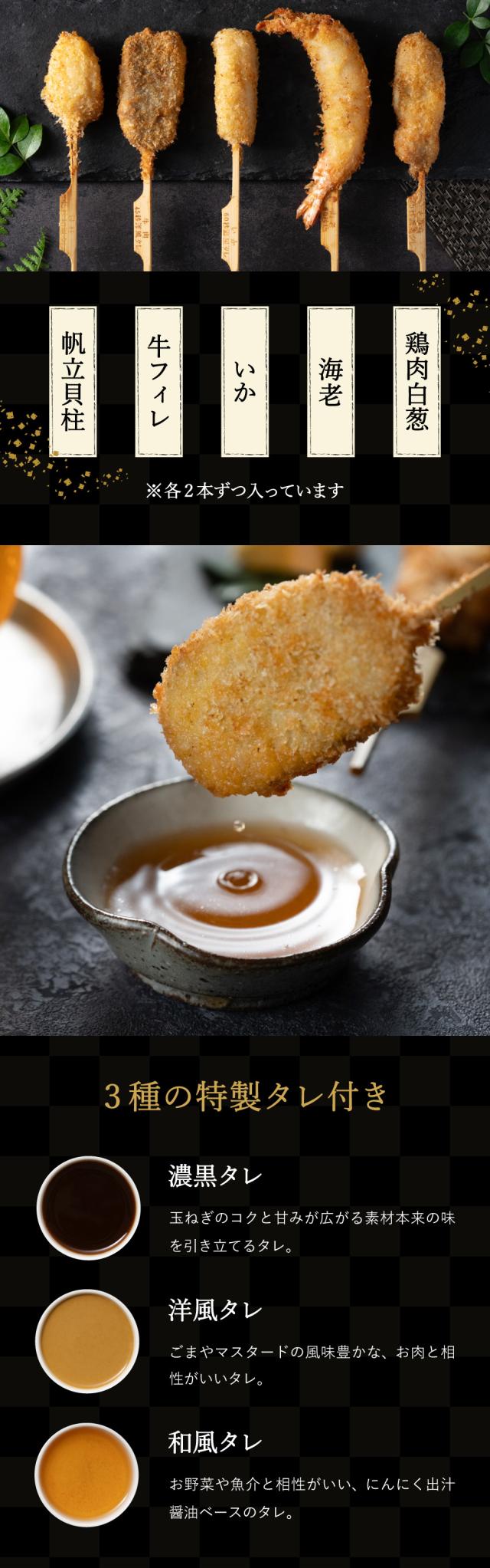 ●商品内容:串揚げ10種(サーモン・ポークフィレ・れんこん・鳴門金時・チーズ・帆立貝柱・牛フィレ・いか・えび・鶏肉白葱各2)計20串、タレ3種