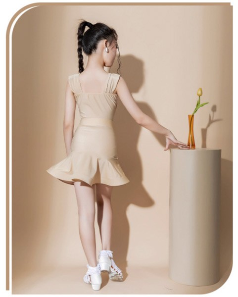 【商品名】ラテン ダンス衣装 キッズ ドレス 社交ダンス衣装 ミモレ丈 ダンスドレス フリンジ付 透け感 大きいサイズ 子供ダンス ダンス服 ワンピース 練習着 団体服 演出着 ステージ衣装 舞台衣装 演出用 ベージュト白 110 120 130 140 150 160 170 180 dm081l9