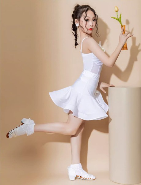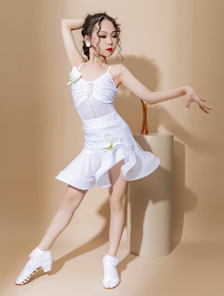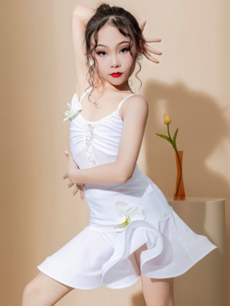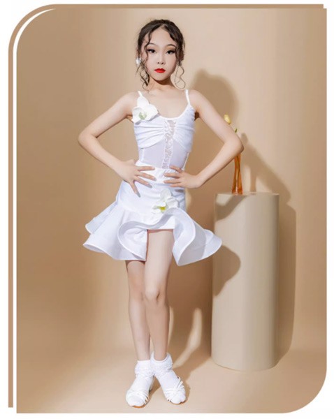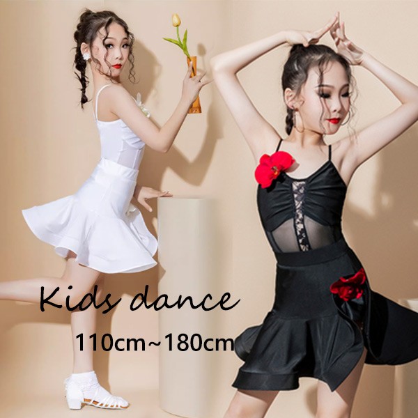 【レビュー投稿で+5%還元】ラテン ダンス衣装 キッズ ドレス 社交ダンス衣装 ミモレ丈 レオタード ダンスドレス フリンジ付 透け感 大きいサイズ 子供ダンス ダンス服 ワンピース 練習着 団体服 演出着 ステージ衣装 ブラック黒 ホワイト白 110 120 130 140 150 160 170 180