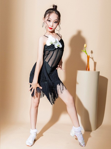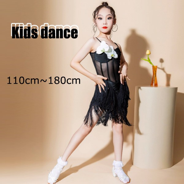 【レビュー投稿で+5%還元】ラテン ダンス衣装 キッズ ドレス 社交ダンス衣装 ミモレ丈 ダンスドレス フリンジ付 透け感 大きいサイズ 子供ダンス ダンス服 ワンピース 練習着 団体服 演出着 ステージ衣装 舞台衣装 演出用 ブラック黒 110 120 130 140 150 160 170 180