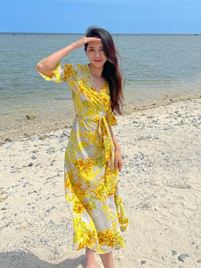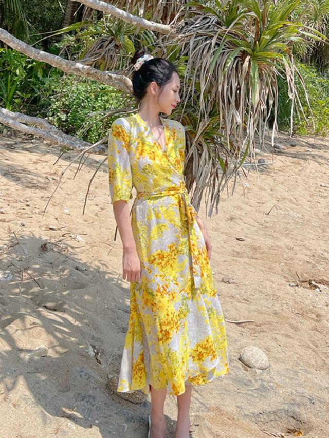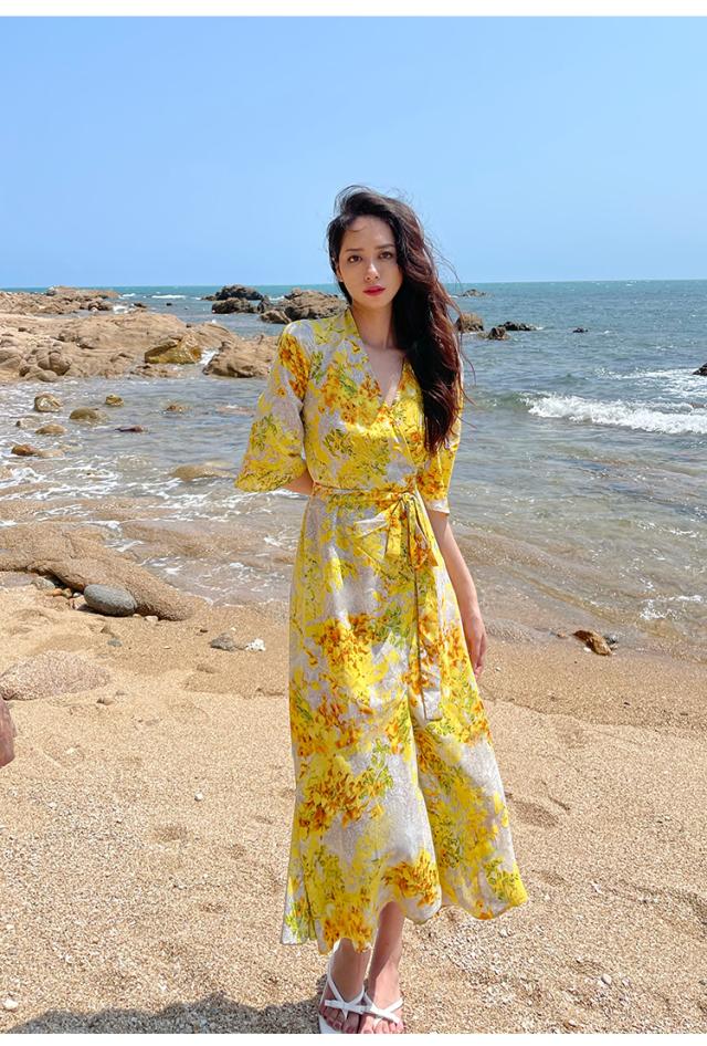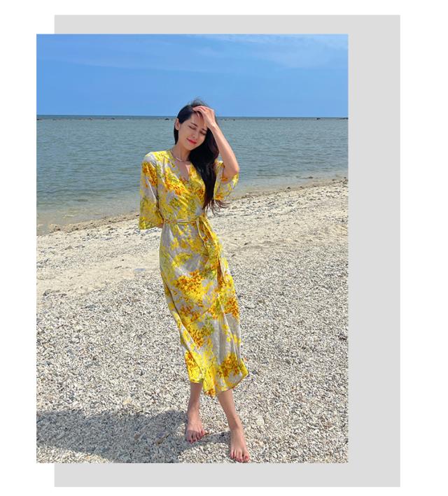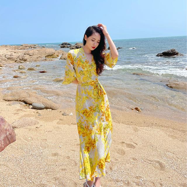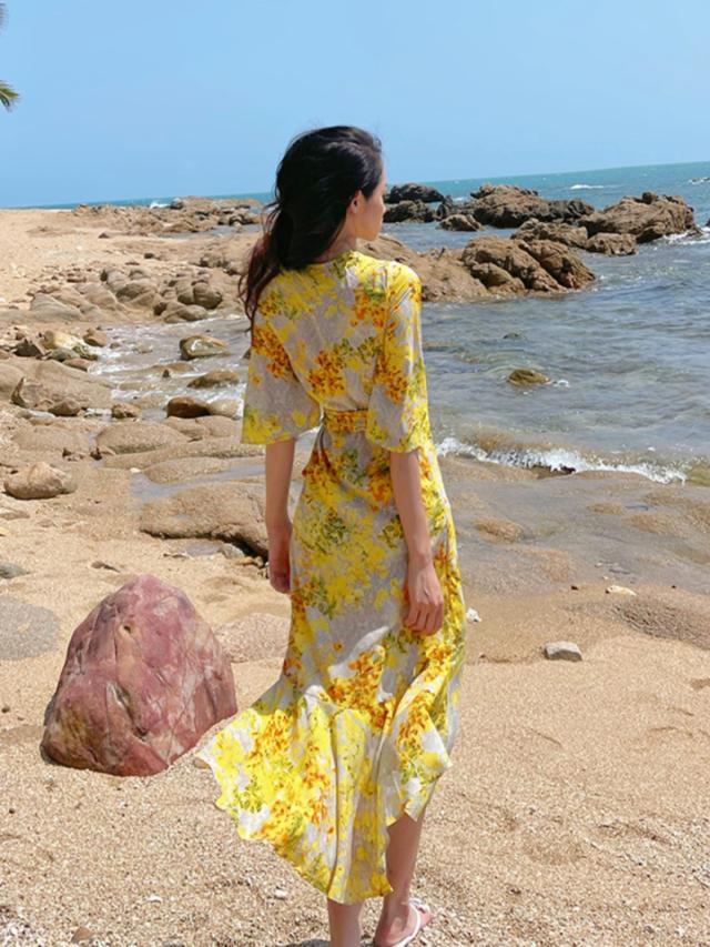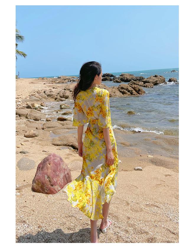 リゾートワンピース レディース 夏 五分袖 花柄 ビーチ vネック ハイウエスト aライン ロング丈 きれいめ おしゃれ