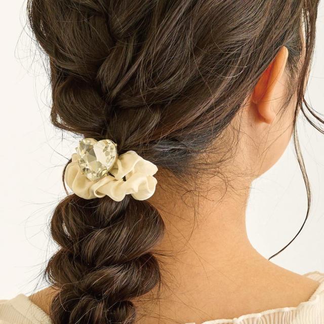 上品な光沢感のある生地に、パールや華やかなラインストーンを散りばめた、ボリューム感たっぷりのゴージャスなデコレーションシュシュ。