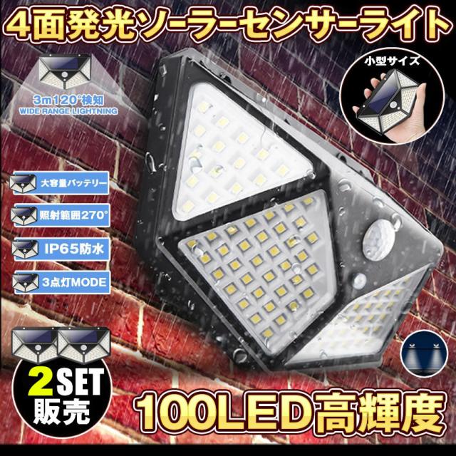 センサーライト ソーラーライト 2個セット 100LED 屋外 4面発光 高輝度 防犯 人感 防水 屋外照明 300°照明範囲 防犯ライト 3つ知能モード 太陽光発電 庭 玄関 駐車場 通路 ガーデンライト 大活躍