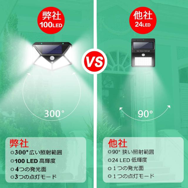 【小型・4面発光・高輝度LED】130*95*78mmの掌サイズで持ち運びやすいです。新たなデザインで発光面が4個まで増やして、照射範囲が300°以上になります。また、最新版のセンサーライトは高輝度LEDライトを搭載しており、従来のソーラーライトより明るくて照明範囲がもっと広いです。Ledセンサーライト一個で屋外を明るく照らして照明効果抜群です。