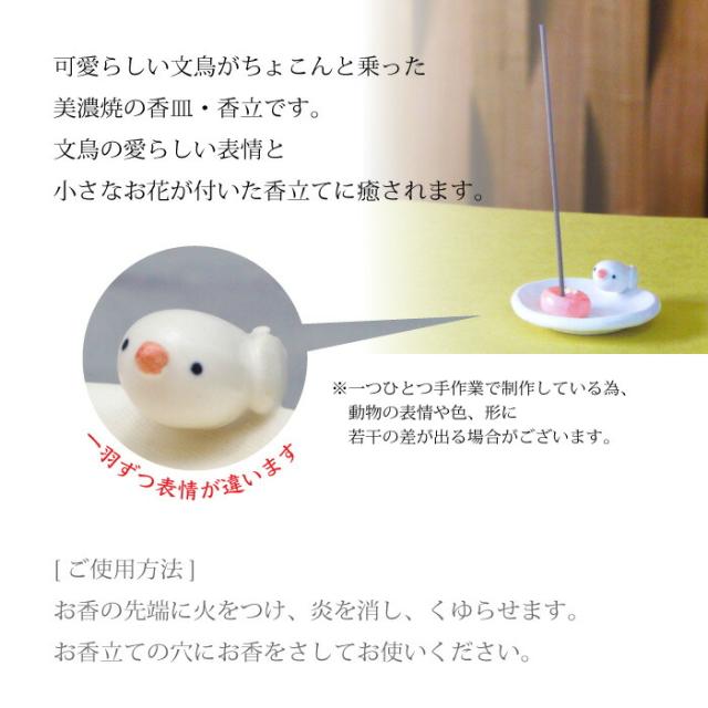 | 商品説明 | ・可愛らしい文鳥がちょこんと乗った、美濃焼の香皿・香立。 ・文鳥の愛らしい表情と小さなお花が付いた香立てに癒されます。 |