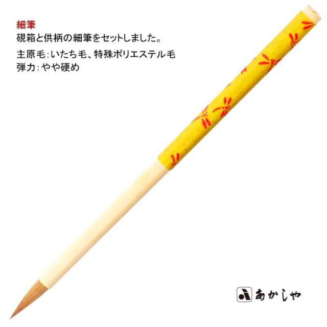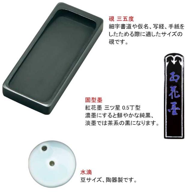 | 内容品 | ・あかしや 細筆(とんぼ)1本 ・墨 1個 ・硯 1個 ・水滴 1個 ・硯箱 1個 |