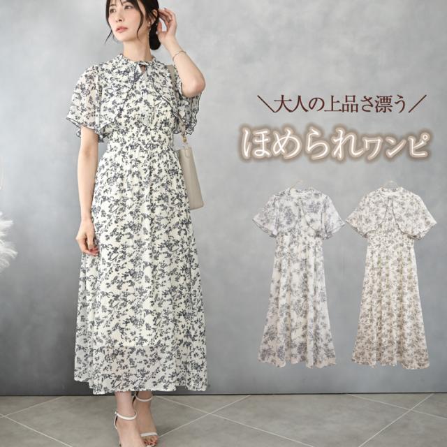 ・エアリーなふんわり素材の 大人可愛い 清楚系ワンピース ケープデザインで上品さをプラス フレアスリーブ で 二の腕カバー でき細見え効果も嬉しいポイント。