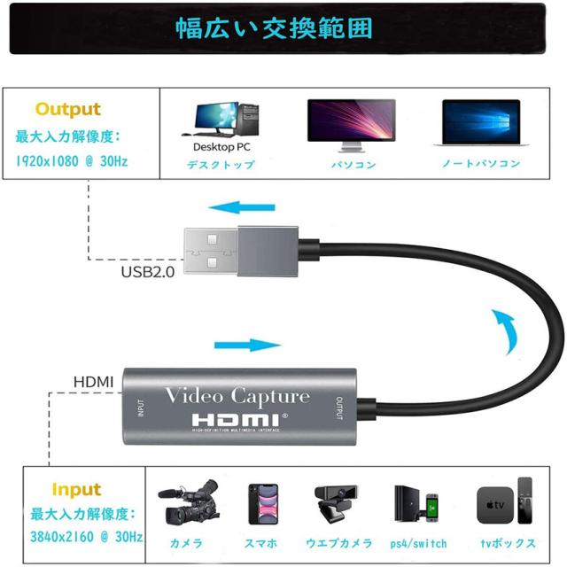 ご利用するにはOBS等キャプチャー用のソフトをインストールしてください【1080P 30fps】HD解像度ビデオ録画とストリーミングの高品質体験を保証するために、USB 2.0インターフェイスを採用し、1080p/30fpsの高品質で録画できます。最大入力解像度:3840x2160 @ 30Hz、最大出力/録画解像度:1920x1080 @ 30Hz。