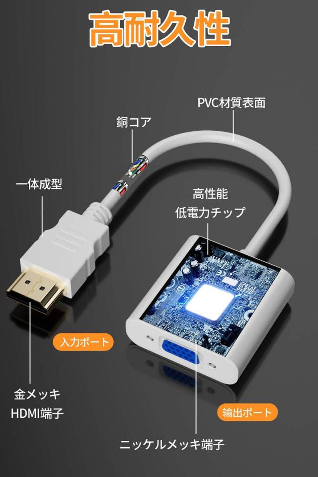 【HDMI TO VGA 変換アダプタ】本製品はHDMIからVGAへの変換アダプターです。コンピューターHDMIから、簡単にプロジェクター、ディスプレイ、LCD、テレビ&モニタ、VGA端子につなぎと接続して映像、番組なのをVGA対応の大画面のテレビに映し出せます。VGAからHDMIまではだめです双方転送に対応しておりません。【高耐久性】金メッキコネクタを採用し、耐久性がもっといい、使用寿命を延ばします。コンパクトなデザインなので、携帯も便利です。