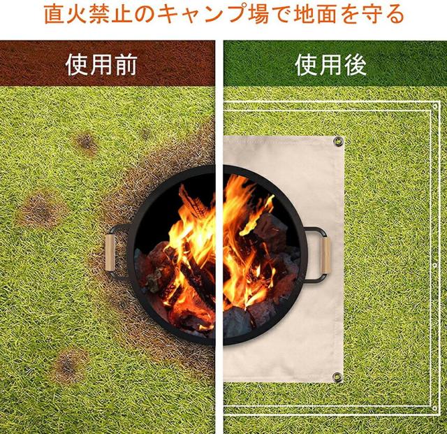 【多用途】直火禁止キャンプ場での焚き火台用ベースシートとして、また、卓上やテント内での バーナー使用時にご使用いただけます。バーベキュー焼肉や卓上コンロの防火に!芝生を保護する目的で焚き火台の下に敷いてます。溶接火花養生シート、各種防火遮断シート、バーナーシート、耐炎カバー類として自由にご使用いただけます。※必ず耐熱温度内でご使用ください。また断熱シートではないため地面への熱を遮断できるわけではありません