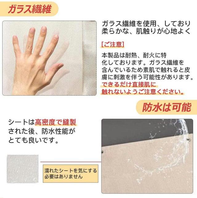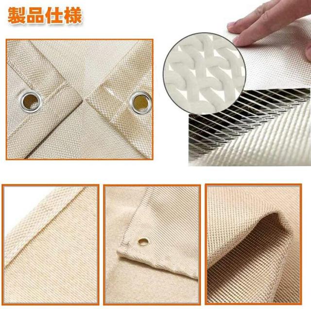 【スパッタシート仕様】:サイズ 使用時:約80cm×60cm 素材:ガラス繊維+シリカコート、シリカコートを追加で作特化したガラス繊維を使用しており柔らかな肌触りが心地よく、他社の製品に比べて素肌で触れるでも皮膚に刺激の感じではありません。