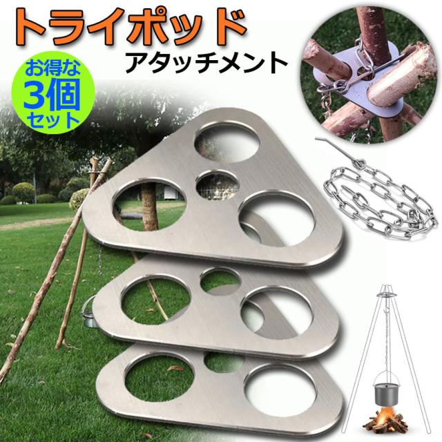 トライポッド アタッチメント 焚き火 3個セット 三脚 金具 キャンプ トライポッド ステンレス 焚き火三脚 アウトドア バーベキュー 焚き火台 リング 軽量 スタンド 炊飯 鍋 料理 ファイヤースタンド 携帯 収納袋付き キャンプ/ピクニック/お釣り