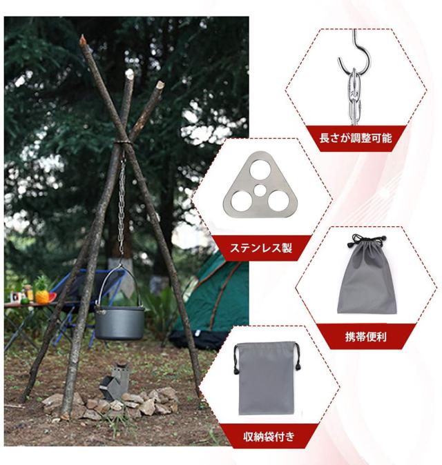 チェーンの先端にあるフックに鍋、飯盒などを吊るせます。焚き火に使うのはもちろん、ランタンやバッグ、小物の吊り下げとしても使えます。