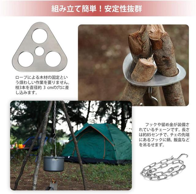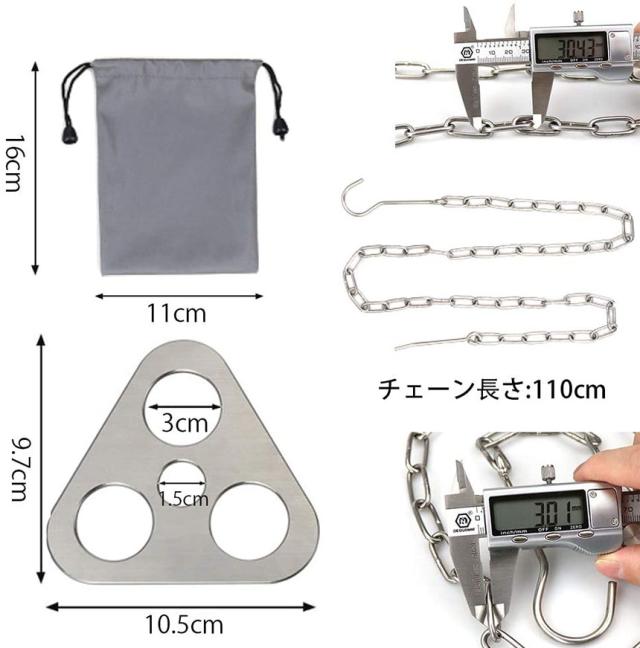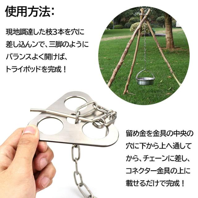 【商品仕様】材質:ステンレス 総重量:約300g セット内容:コネクター金具×1、チェーン×1、収納ポーチ×1。【枝木でDIY】枝でトライポッドを簡単に作ることができます。DIYを楽しみながら、アウトドア活動の雰囲気を一層盛り上げます。