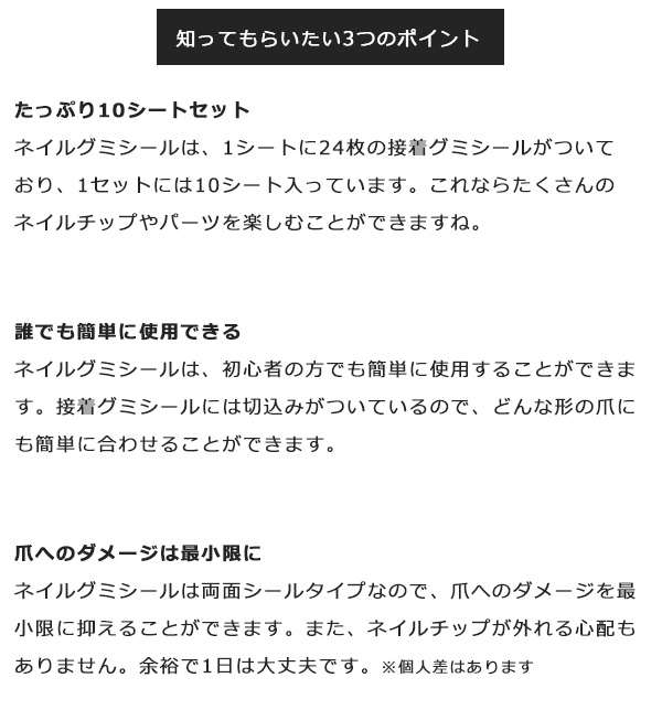 ネイルグミシールは、1シートに24枚の接着グミシールがついており、1セットには10シート入っています。これならたくさんのネイルチップやパーツを楽しむことができますね。