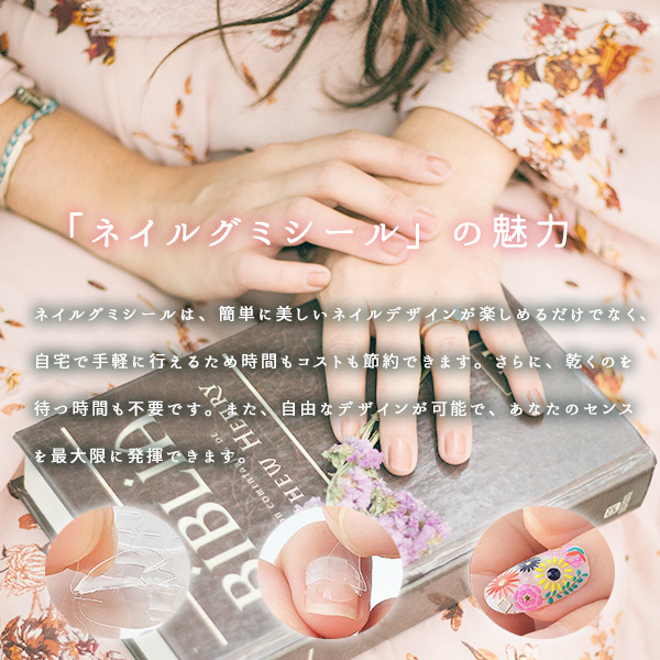 ネイルグミシールは、簡単に美しいネイルデザインが楽しめるだけでなく、自宅で手軽に行えるため時間もコストも節約できます。 さらに乾くのを待つ時間も不要です。また自由なデザインが可能で、あなたのセンスを最大限に発揮できます。