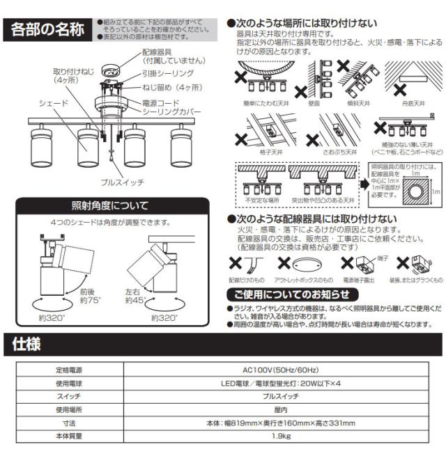| 使用電球(電球別売) | LED電球/電球型蛍光灯:消費電力20W以下×4※白熱電球使用禁止 |