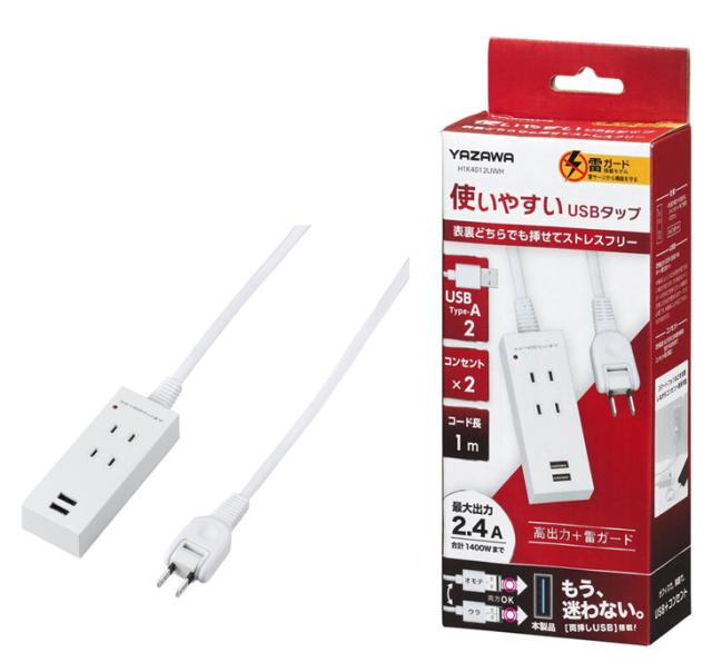 YAZAWA ヤザワコーポレーション H1K4012UWH 雷ガード付両挿しUSBタップ 2個口1mホワイト【日本国内専用】