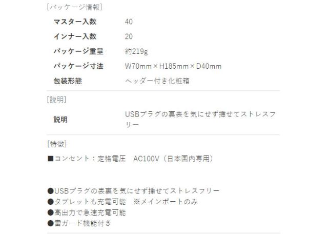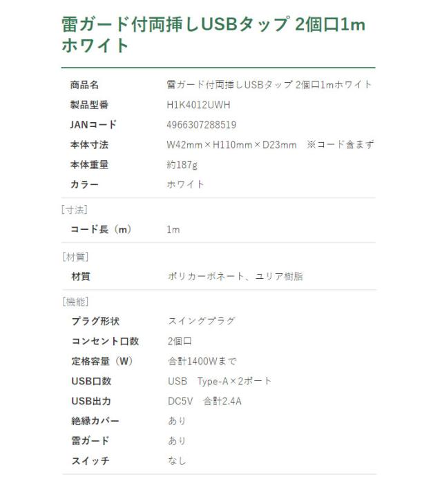 | H1K4012UWH 雷ガード付両挿しUSBタップ 2個口1mホワイト【日本国内専用】 スペック情報 | |