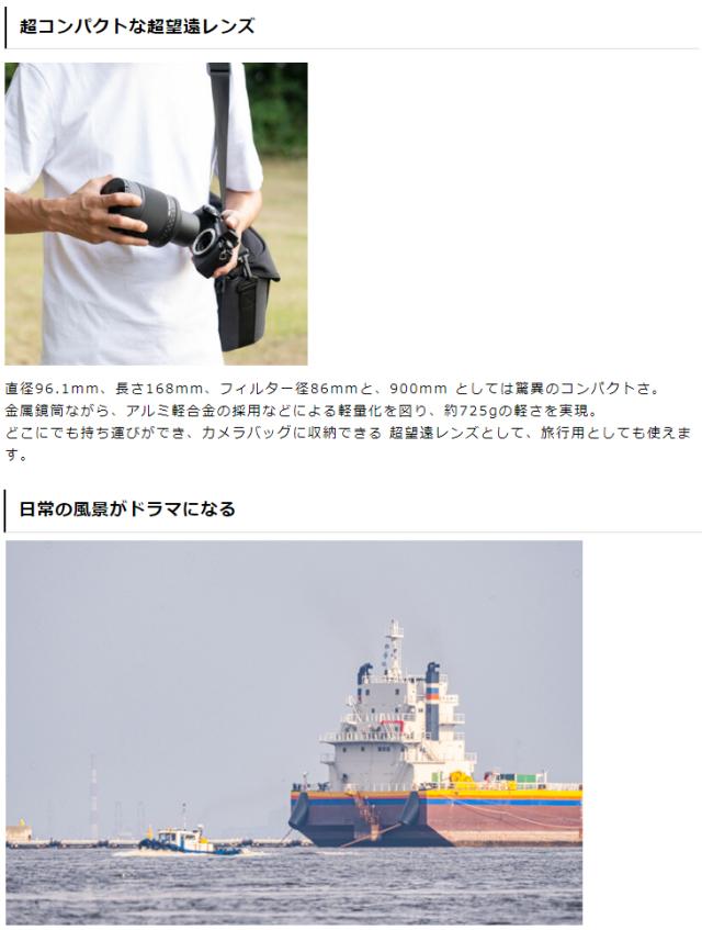 1kgを大きく切る725gの軽さ。APS-Cフォーマット専用設計とすることで、900mm(35mmフルサイズ換算1350mm)としては圧倒的なコンパクトサイズを実現しました。