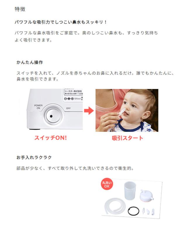 | 付属品 | ・吸引器本体・専用ACアダプター・吸引チューブ・チューブストッパー・ノズルコネクター・シリコンノズル2個・取扱説明書兼保証書・添付文書・かんたんガイド |