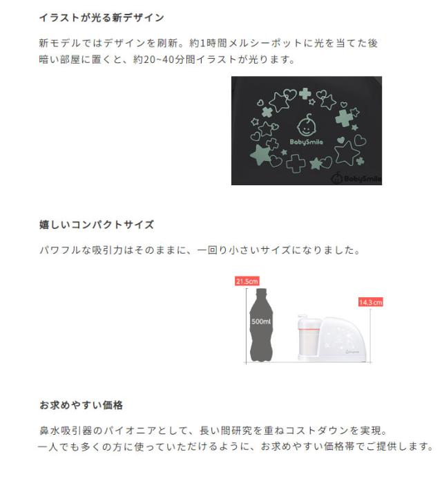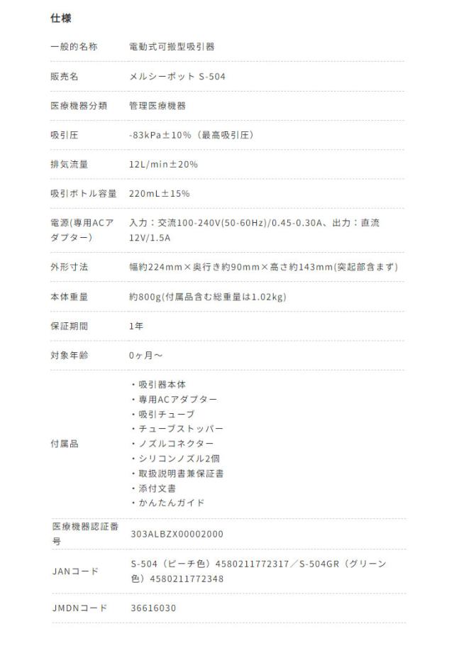 | S-504(ピーチ色) 電動鼻水吸引器 メルシーポット スペック情報 | |