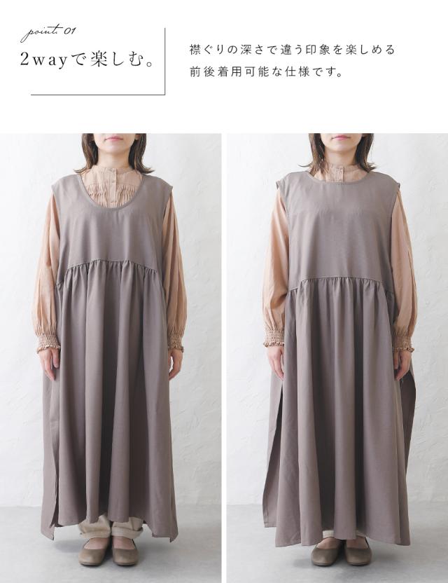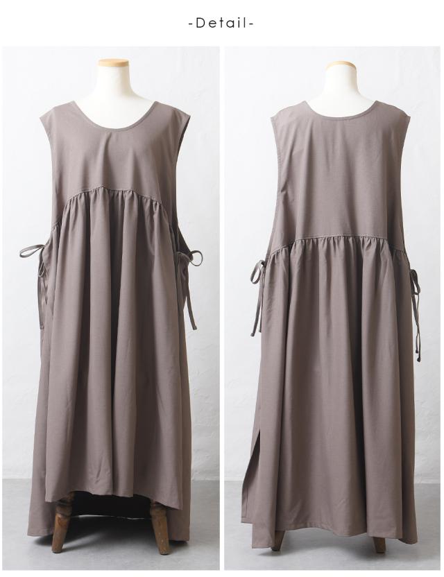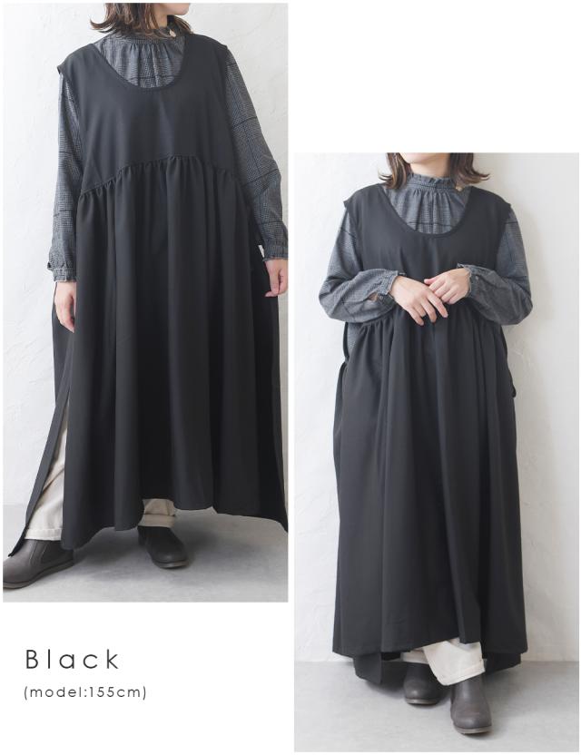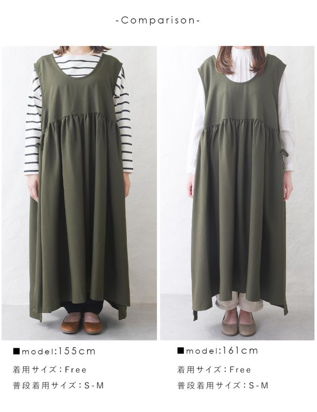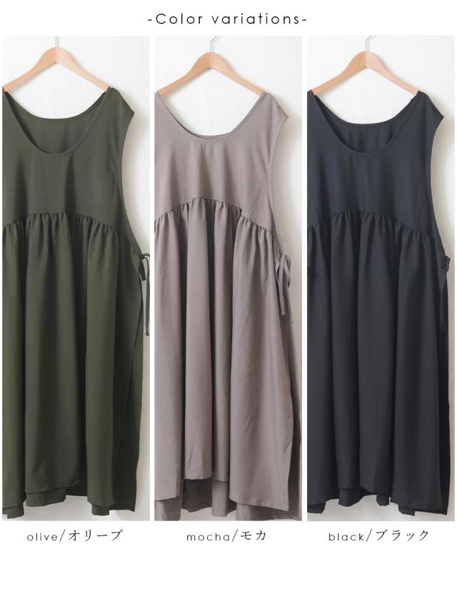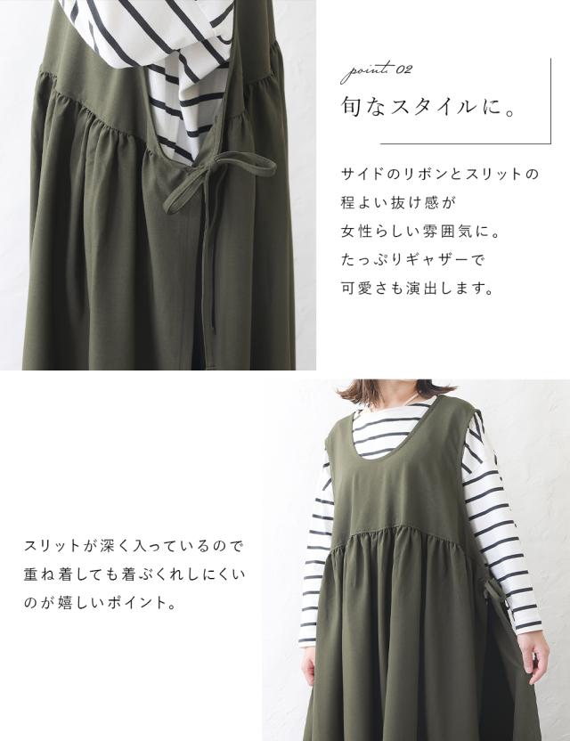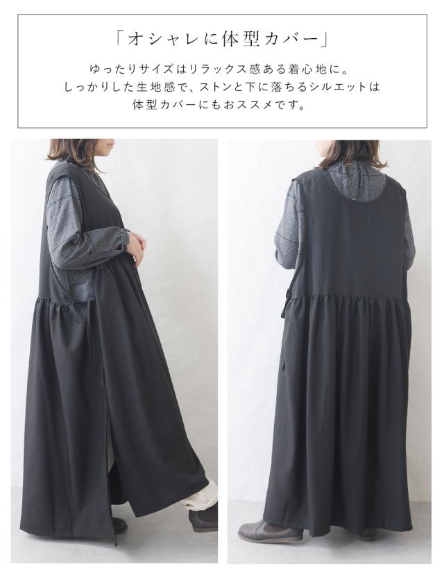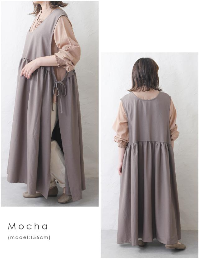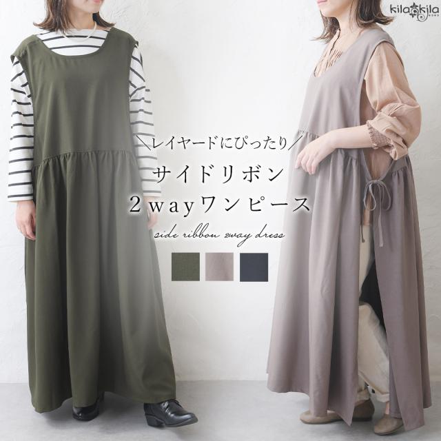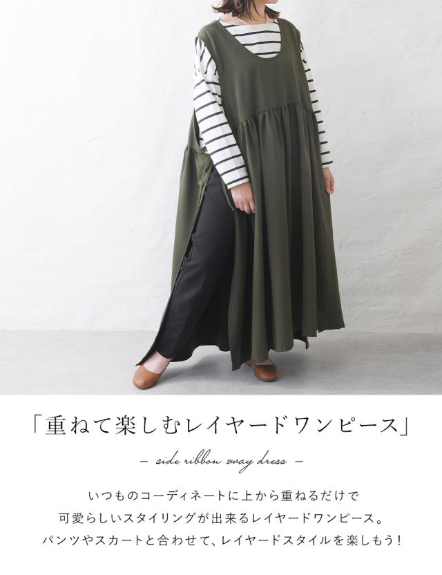 ワンピース レディース レイヤード 重ね着 レイヤードワンピース サイドリボン ロング ロングワンピース ゆったり ナチュラル カジュアル ロング丈 マキシ丈 体型カバー 無地 黒 ブラック オリーブ モカ 秋 冬