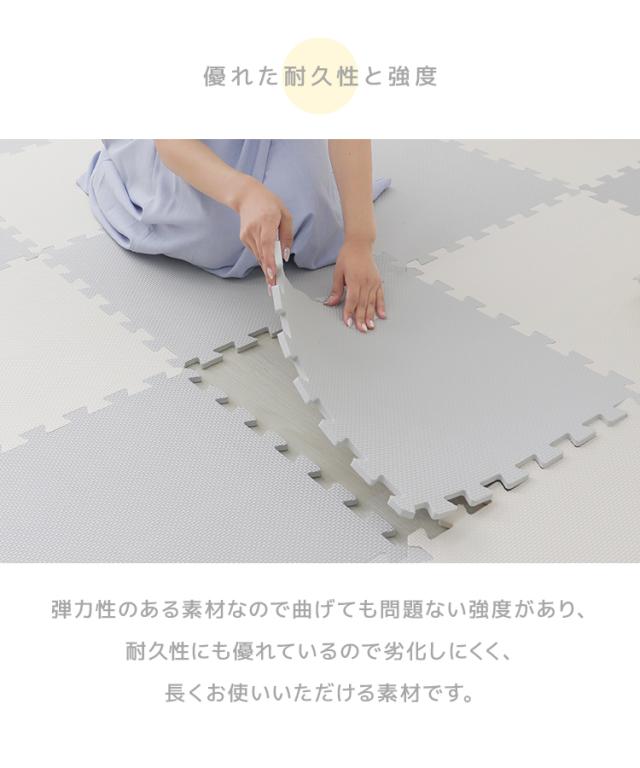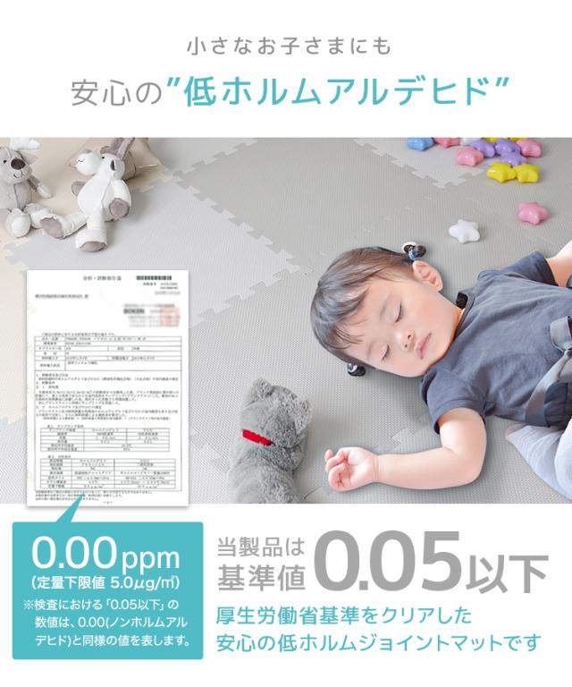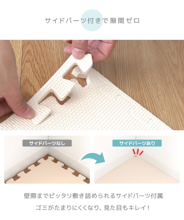 | 注意事項 | ・マットの上での暖房器具(ファンヒーターやストーブ)の使用は避けて下さい。 ・PE樹脂の臭いが最初はある程度しますが、人体には影響ありません。臭いによる返品はお受けできませんので、臭いの気になる方はその旨をご了承の上ご購入をお願いいたします。 ・重量物を載せますと、マットが凹み変形する恐れがあります。 ・サイドパーツ単体の販売は行っておりません。サイドパーツをカットして使用する際はご注意下さい。 ・商品は、モニターによって色合いが異なって見える場合があります。 ・入荷時期によって、厚みや幅に多少の誤差がある場合がございます。あらかじめご了承ください。 ・床材との温度差で製品が反る場合があります。 ・仕様・デザインは改良のため予告なく変更することがあります。 ・ジョイントマットに使用する樹脂素材については、より安全な素材となるよう技術の向上がなされており、その過程で現在使用している素材はPEと記載を行うことが適切となりましたので、2019年よりEVAからPEに表記を変更しました。日本の大手量販店でも随時、記載の変更が行われており、品質を悪化させたものではありませんのでご安心ください。 |