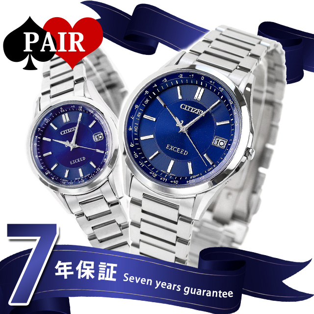 正規品 7年保証キャンペーン 送料無料 ペアウォッチ シチズン エクシード ダイレクトフライト ペアモデル チタン ソーラー ソーラー電波 日本製 光発電エコ・ドライブ電波 メンズ レディース 腕時計 pair-exceed29 CITIZEN EXCEED Eco-Drive アナログ ◆確かな品質と洗練されたデザイン。大人のためのドレスウオッチ、シチズン EXCEED(エクシード)。シンプルでスマートな印象の3針モデルに、ブルー文字板のペアウオッチが登場。「限界を超える」「卓越した」を意味するエクシードの名にふさわしい高機能。確かな技術と品質、洗練されたデザインをベースとした大人のための高級ドレスウオッチです。グローバル電波を受信し、現地時刻にすばやく合わせることができるダイレクトフライト機能搭載。文字板の中央とインデックス部分の文字板の仕上げを描き分け、シンプルでありながらもメリハリの効いたデザインに仕上げています。ペアウォッチやプレゼントとしてもおすすめです。 メンズ品番:CB1110-61L レディース品番:ES9370-62L