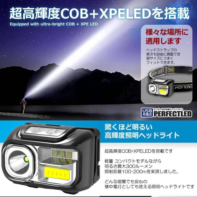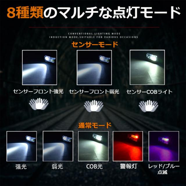 【センサモード】手を離して、センサーモードで手を振るだけでライトのON / OFFができます。暗闇での使用に必要な便利さを提供します。モード間を簡単に変更できます。【8つモード】 3つのセンサーモード:フロント強光、フロント弱光、COBライト。5つの主要モード:フロント強光、フロント弱光、COBライト、警報灯、レッド/ブルー点滅。