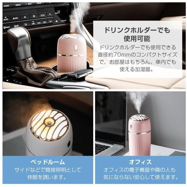 ドリンクホルダーでも使用できる直径約70mmのコンパクトサイズで、お部屋はもちろん、車内でも使える加湿器。