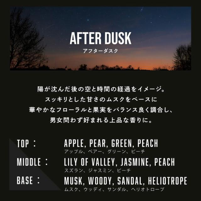 ![]() 陽が沈んだ後の空と時間の経過をイメージ。 スッキリとした甘さのムスクをベースに華やかなフローラルと果実をバランス良く調合し、男女問わず好まれる上品な香りに。 |