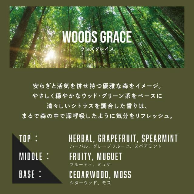 ![]() 安らぎと活気を併せ持つ優雅な森をイメージ。 やさしく穏やかなウッド・グリーン系をベースに 清々しいシトラスを調合した香りは、 まるで森の中で深呼吸したように気分をリフレッシュ。 |
