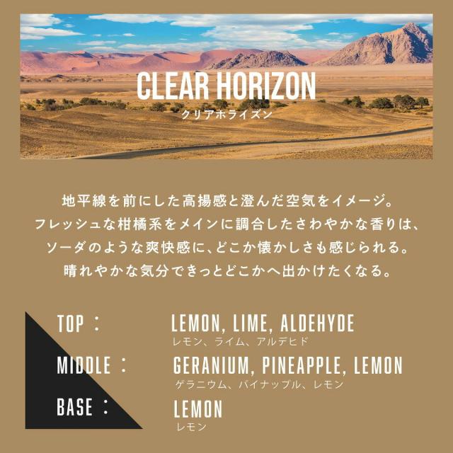 ![]() 地平線を前にした高揚感と澄んだ空気をイメージ。 フレッシュな柑橘系をメインに調合した爽やかな香りは、 ソーダのような爽快感で、どこか懐かしさも感じられる。 晴れやかな気分できっとどこかへ出かけたくなる。 |