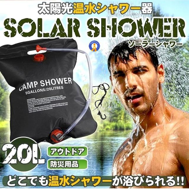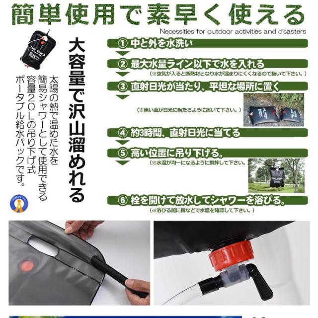 太陽の熱で温めた水を簡易シャワーとして使用できる容量20Lの吊り下げ式ポータブル給水パックです。パック本体に水を入れ、日当たりの良い場所に吊り下げておけば太陽熱により内部の水を効率良く温める事ができます。フック付のロープが付属しており、様々な場所に吊り下げが可能。使わない時も小さく折り畳めるためかさばりません。水を入れて重さが増した状態でも芯棒を入れることで持ち手部分が変形することなく持ち運びや吊り下げが行えます。スポーツや水泳の後に軽く汗を流したりする他屋外活動時の手洗いなどにも大活躍。災害時の備えとしても重宝します。・カラー:ブラック・主材質:ビニールレザー、テトロン、PP・容量:約20L・平置きサイズ:約40×60cm・重量:約420g送料無料