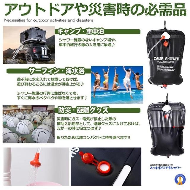 2個セット 温水シャワーパック 容量20L 太陽熱 吊り下げ式 給水 バッグ アウトドア 簡易 ポータブル 緊急時 海水浴 野外 スポーツ直後 どこでも温水シャワー 夏場防災 災害 DOKOSUUI