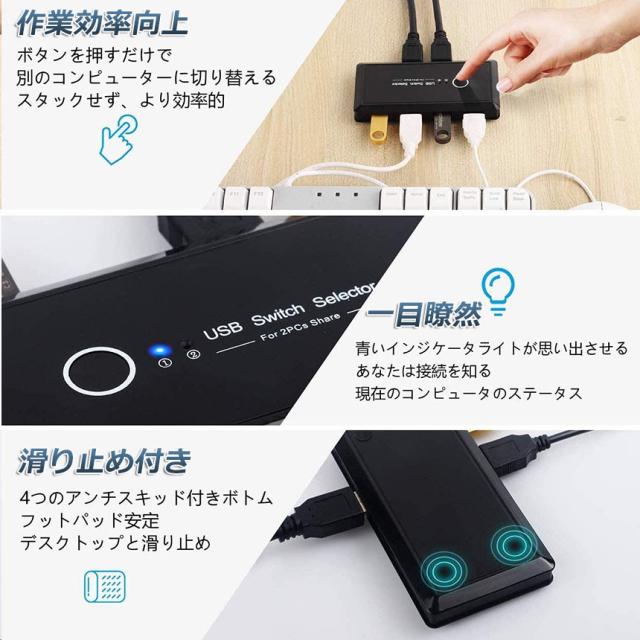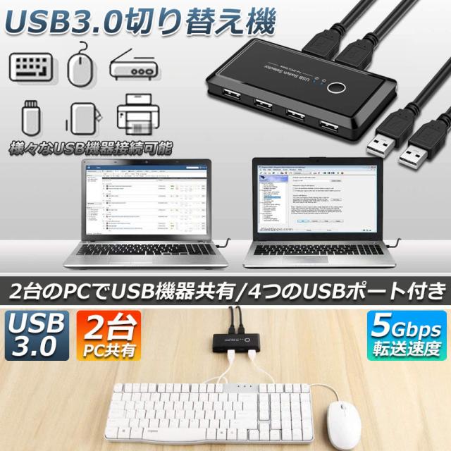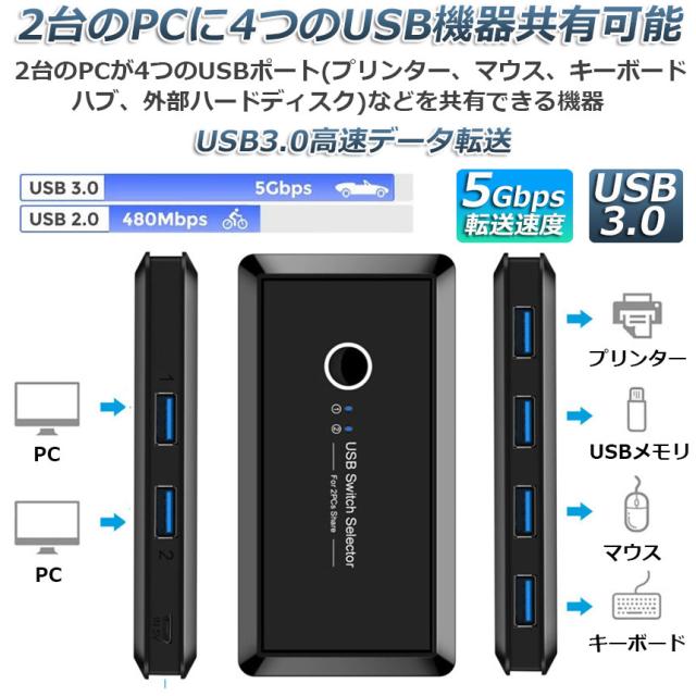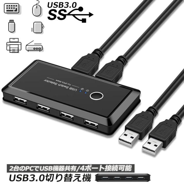 USB3.0 切り替え機 切替器 pc2台用 usb 切替器 USB3.0 4ポート 高速転送 セレクター スイッチ 手動切替器 プリンタ マウス キーボード ハブ ハードディスク など 切替 ケーブル付き