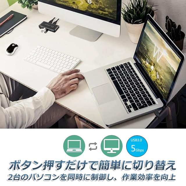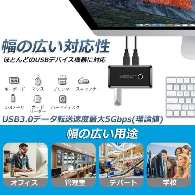 【USB3.0 切替器 PC2台用】1組のプリンタ、マウス、キーボード、外付けハードディスク、ハブなどのUSB機器を2台のパソコンで共有できる切替器です。ノートパソコンでもデスクトップパソコンでも対応しており、2台のPCを1台にまとめて便利です。【USB3.0高速4ポート】USB3.0 高速4ポート付き、USB3.0準拠のバスパワー動作で5Gbps(理論値)の高速データ送信に対応しています。従来のUSB2.0&USB1.1機器の接続も可能です。インターフェース(パソコン側):USB×2;インターフェース(周辺機器側):USB3.0 ×4。