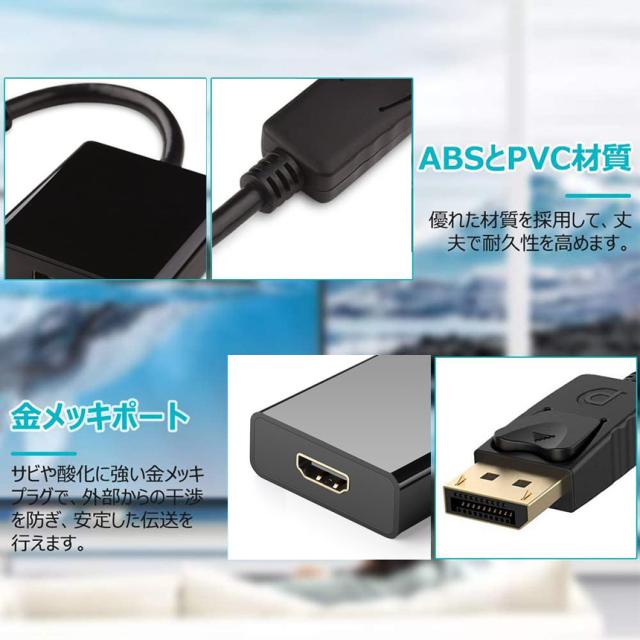 DisplayPortポートからHDMIポートまで変換アダプタ、DisplayPortパソコンからテレビ、モニターなどプロジェクターなどHDMI設備を接続して、大きな画面を楽しむ。ご注意※双方向の信号転送できない、HDMIからDisplayPortへの変換は対応しておりません。DisplayPortからHDMIポートへ変換のみですデスクトップPC、HP、Dell、LenovoなどのDisplayPort付き機器に対応しています。 映像・音声同期出力、ミラーリング・拡張モード・マルチディスプレイ対応、最大解像度は1080P@60Hz(1920*1080)。非圧縮・圧縮デジタルオーディオ(7.1ch、5.1ch、2ch)など対応。(※PC側やディスプレイ側で音声出力の設定が必要になることがございます。)