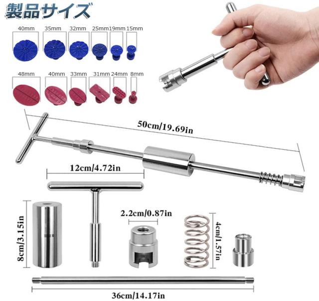 【サイズ異なる吸盤】応用範囲:車&バイクのボディ&フェンダーの補修や、ドア、冷蔵庫、洗濯機などの凹み修理もできます。凹みの大きさによってタブを利用してください。【凹みの修理作業ツールキット】これは12個のプラータブと1個のスライドハンマーTバーのセットです。金属パネルの凹みの修理作業に対応したツールキットで、高品質のプラスチック、金属で作られて、軽量で、耐久性があります。