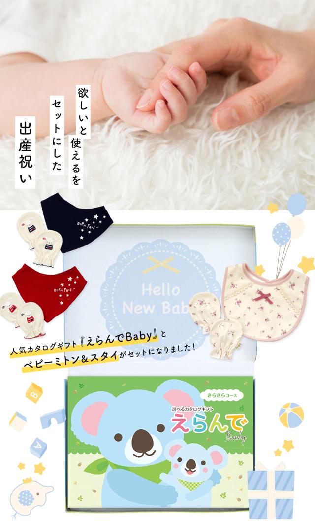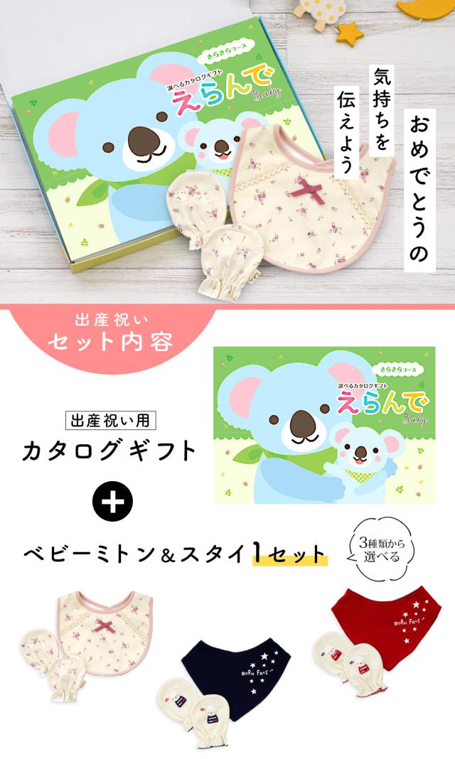 出産祝い カタログギフト えらんで きらきらコース & ミトン & スタイ セット<新作商品>【3点セット ビブ バンダナスタイ 3種から選べる ビセラ 日本製 国産 お祝い 男の子 女の子 赤ちゃん ベビー 綿 ギフトセット 出産 BE CERA】