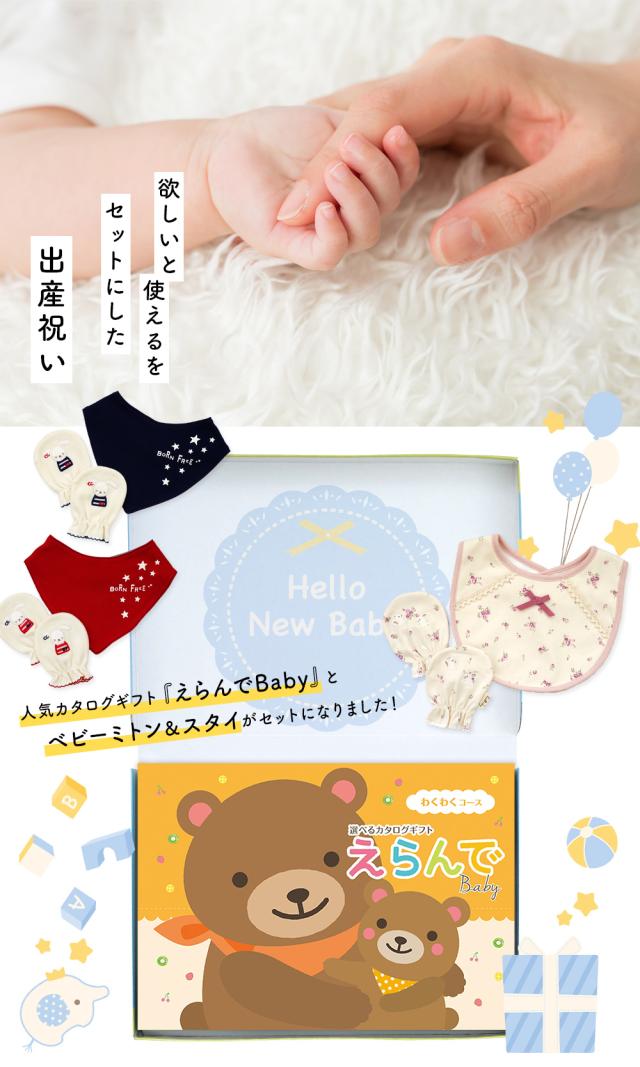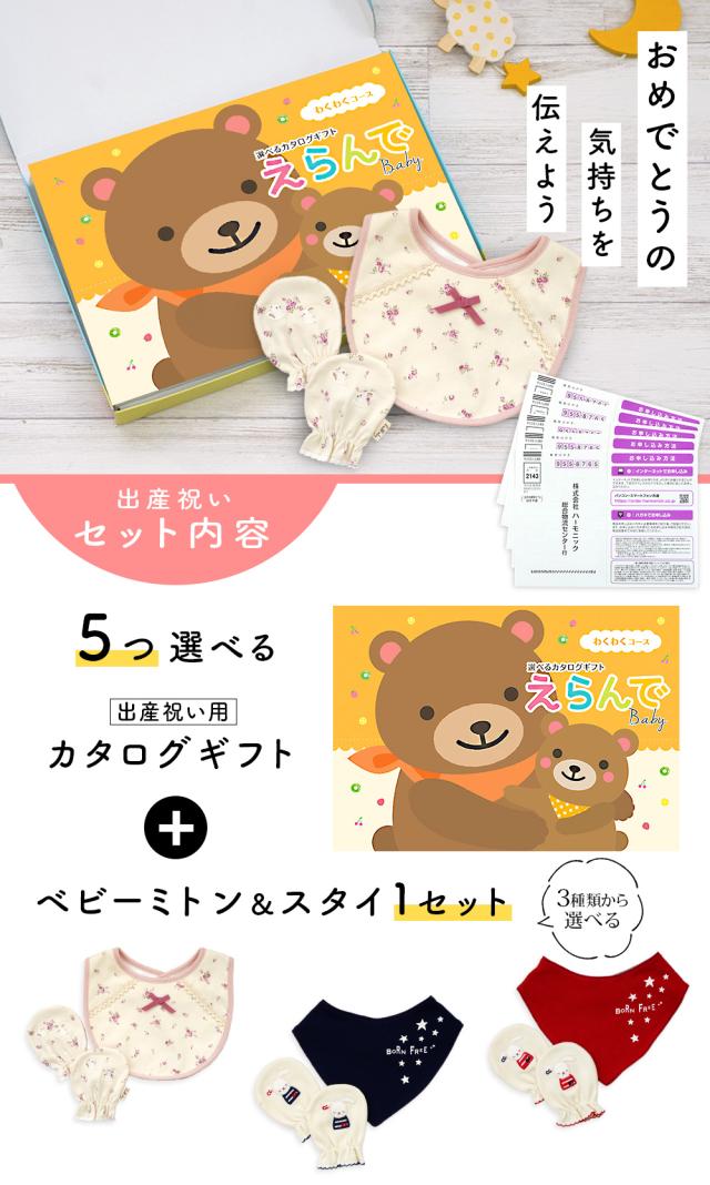 出産祝い カタログギフト えらんで 5つ選べる わくわくコース & ミトン & スタイ セット<新作商品>【3点セット ビブ バンダナスタイ 3種から選べる ビセラ 日本製 国産 お祝い 男の子 女の子 赤ちゃん ベビー 綿 ギフトセット 出産 BE CERA】