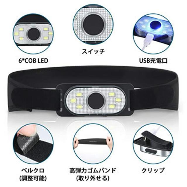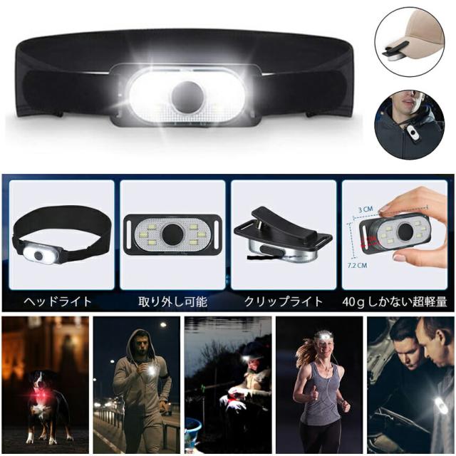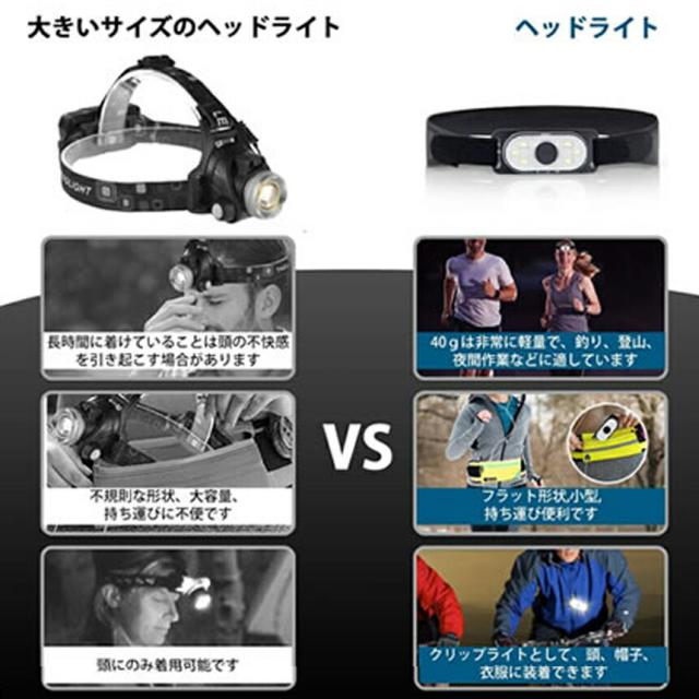 不規則なヘッドライトは持ち運びに不便で、約7.2CM*3CM*2CMサイズのフラット形状で、持ち運びが楽です。伸縮性のあるバンドが自由な長さに調節できます。約40g軽量型長時間で頭部に着けていても疲れません。そして、クリップライトとして、頭、帽子、衣服に装着できます。